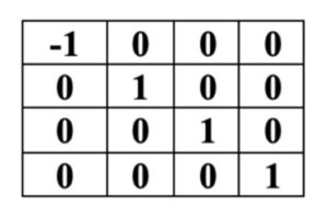 (vous avez peut-être deviné que la taille du Lambdoma est de 4×4 parce que nous vivons dans un espace manifeste à quatre dimensions). Dans l’espace réel, celui qui n’est pas approximé par la géométrie euclidienne, celui de la relativité générale par exemple, les cases du Lambdoma sont remplies de formules beaucoup plus complexes. En physique, ce type de Lambdoma est appelé « métrique » de l’espace-temps et définit sa géométrie. En mathématiques, la métrique est un objet algébrique complexe appelé « tenseur métrique », mais nous n’en parlerons pas ici. Disons simplement que tout espace mathématique et physique est décrit géométriquement par son tenseur métrique, qui sert finalement à calculer les distances entre deux points de cet espace. Dans l’espace plat euclidien, tel que celui décrit par le Lambdoma ci-dessus, la distance entre deux points est un segment de droite et se calcule de manière cartésienne à l’aide du théorème de Pythagore.