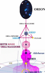 Les Sept Rishis de la Grande Ourse sont le Centre de la Tête du Grand Homme Cosmique, ils « poussent en avant et au-delà » toute la manifestation et l’évolution des Sept Logoi solaires, ils sont le Grand Chariot des Sept Rayons qui tire depuis le Nord la charrue de la Vie (Septem triones = sept bœufs) :
